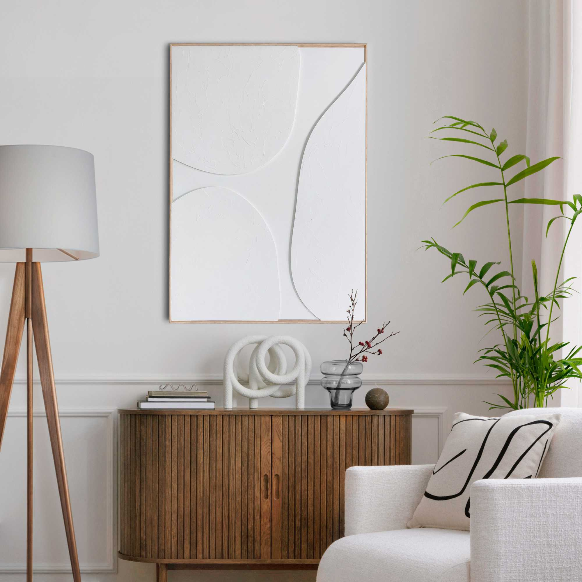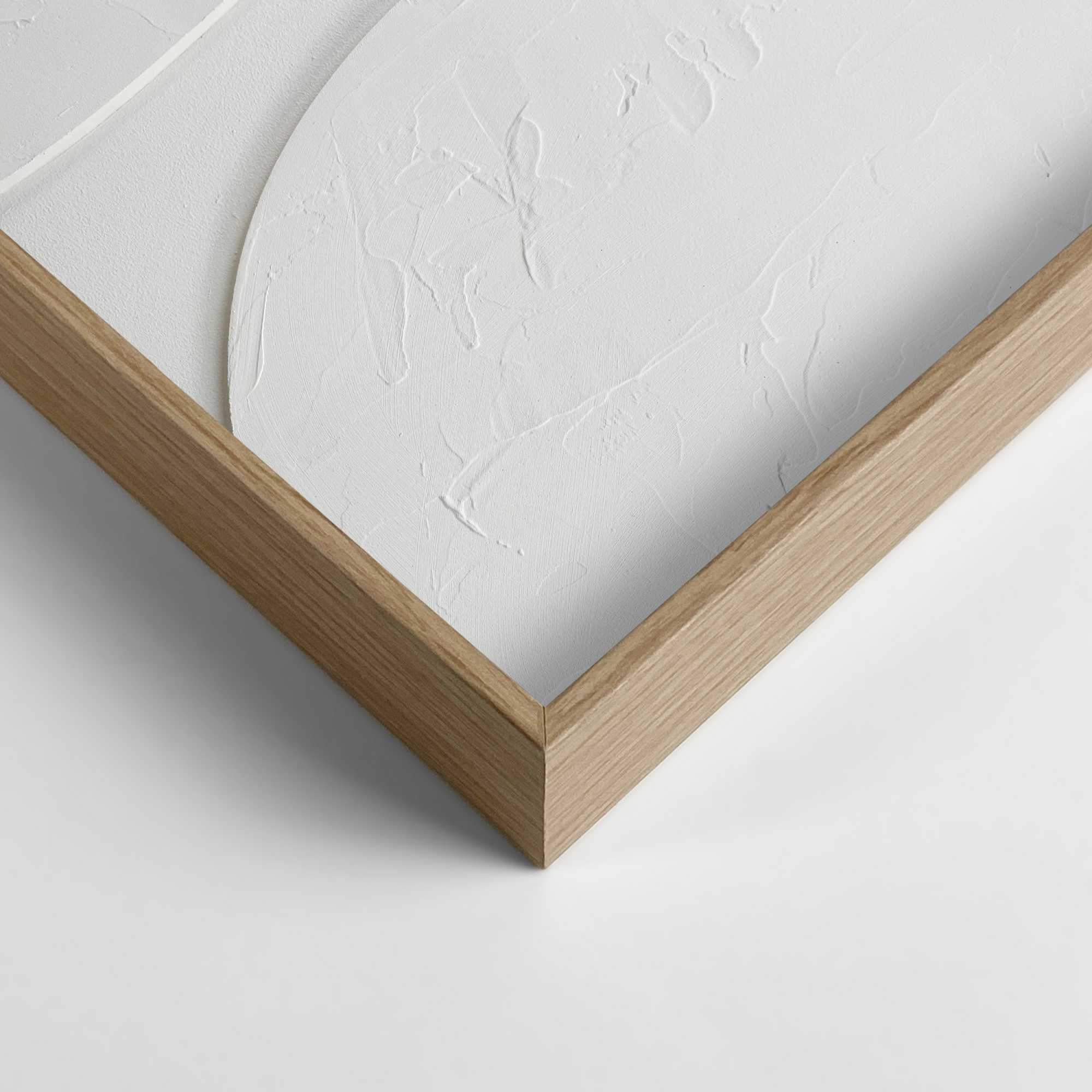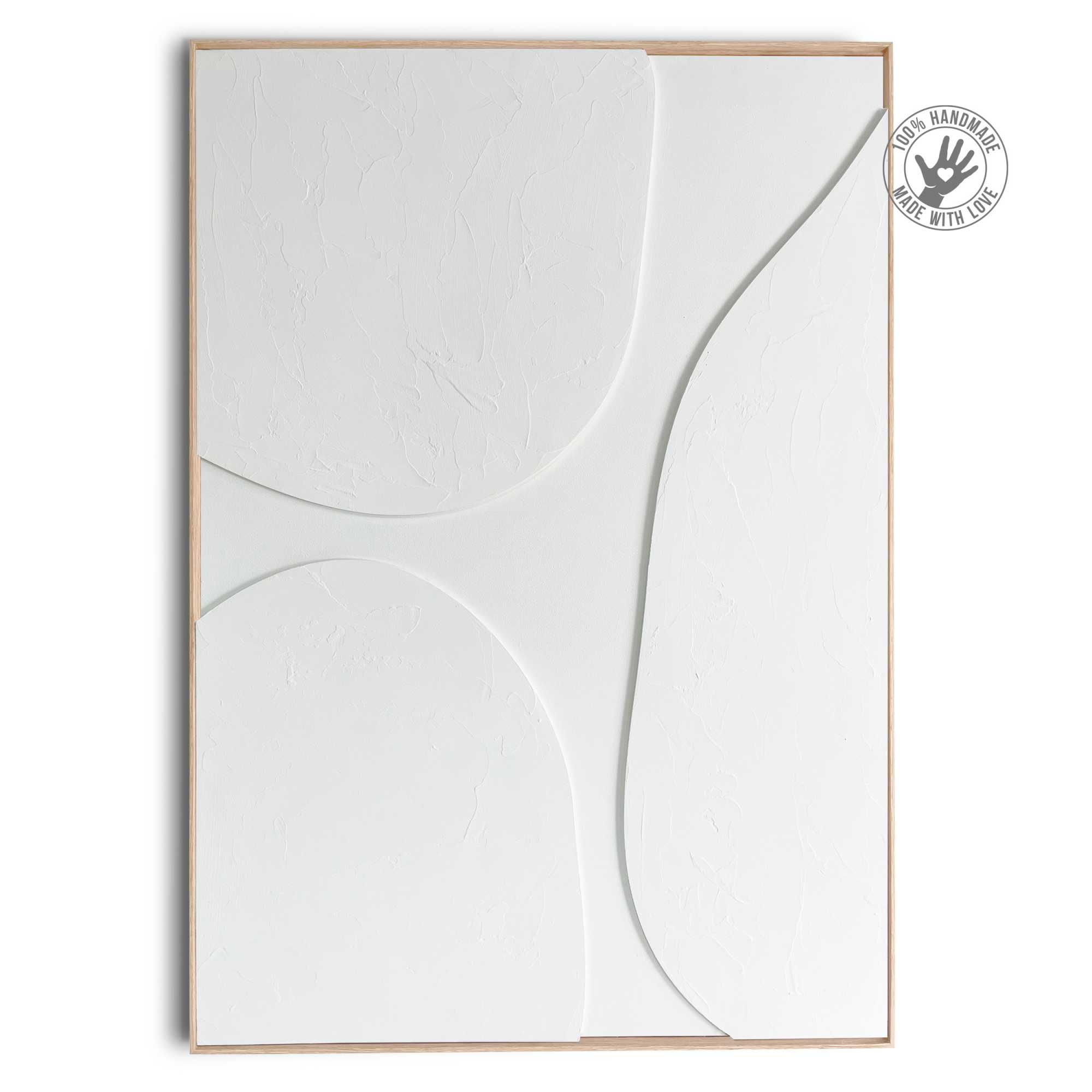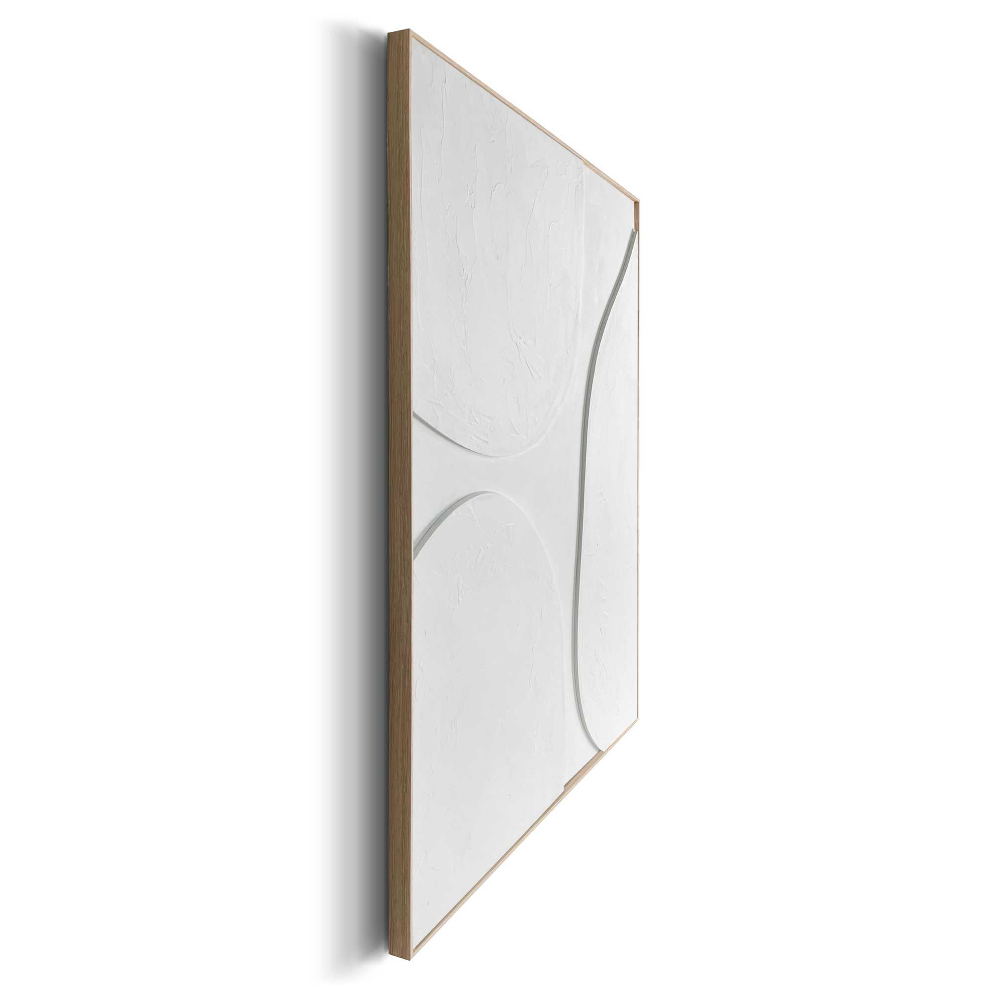 · Handgefertigter Wanddeko mit abstraktem Relief in weiß, eingerahmt von einem Holzrahmen.