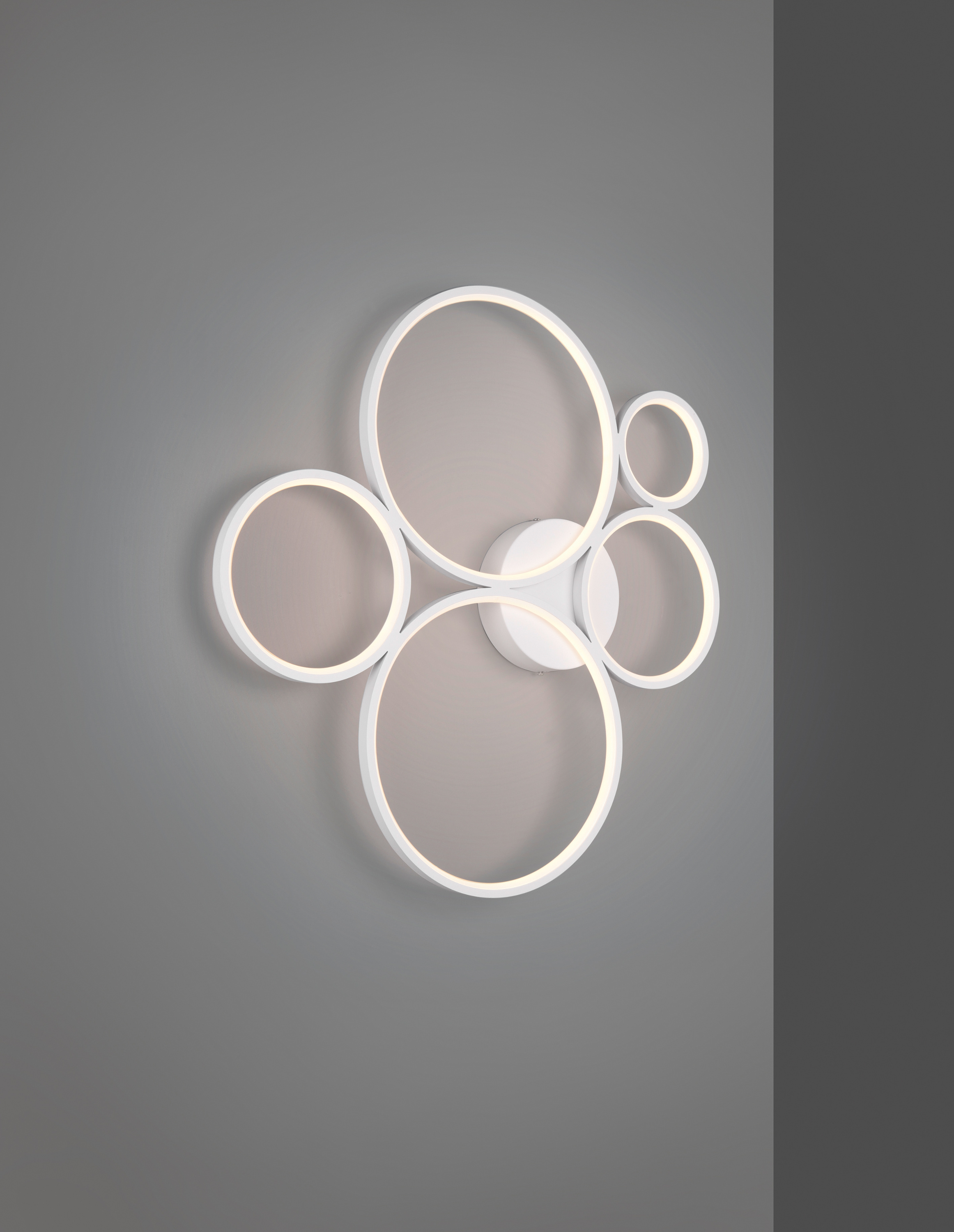 · Mit ihren fünf aneinander hängenden Ringen unterschiedlichen Durchmessers, ist die Deckenleuchte RONDO ein echter Eyecatcher. Die Deckenleuchte verfügt über einen integrierten SWITCH Dimmer, der über den Lichtschalter gesteuert wird. Damit lässt sich die Helligkeit der in den jeweiligen Kreis-Innenseiten verbauten LEDs über den Lichtschalter in drei Stufen steuern. Die Deckenleuchte ist ein wahres Deko-Element und wertet jeden Wohnraum stilvoll auf.Dank der Farbgestaltung in Weiß matt, kann die Leuchte mit vielen Einrichtungsstilen kombiniert werden. Für eine energiesparende Beleuchtung empfiehlt sich die Verwendung eines LED Leuchtmittels. Diese sind eine optimale Alternative zu herkömmlichen Halogen Leuchtmitteln und stehen für eine hohe Lichtqualität und eine Energieeinsparung von bis zu 80%. Zusätzlich profitieren Sie bei LED Leuchtmitteln von einer langen Lebensdauer, einer geringen Wärmeentwicklung und schonen gleichzeitig die Umwelt.