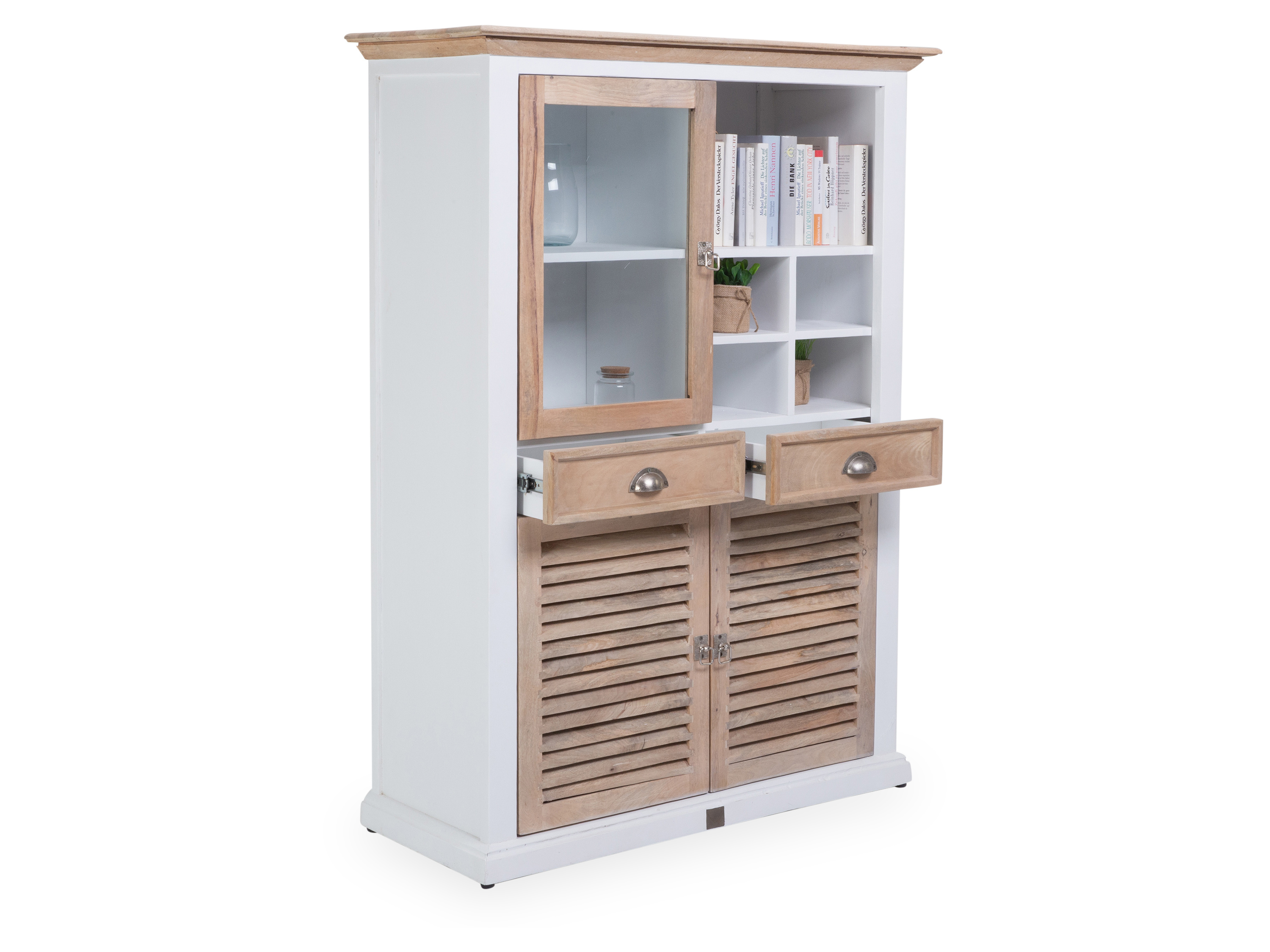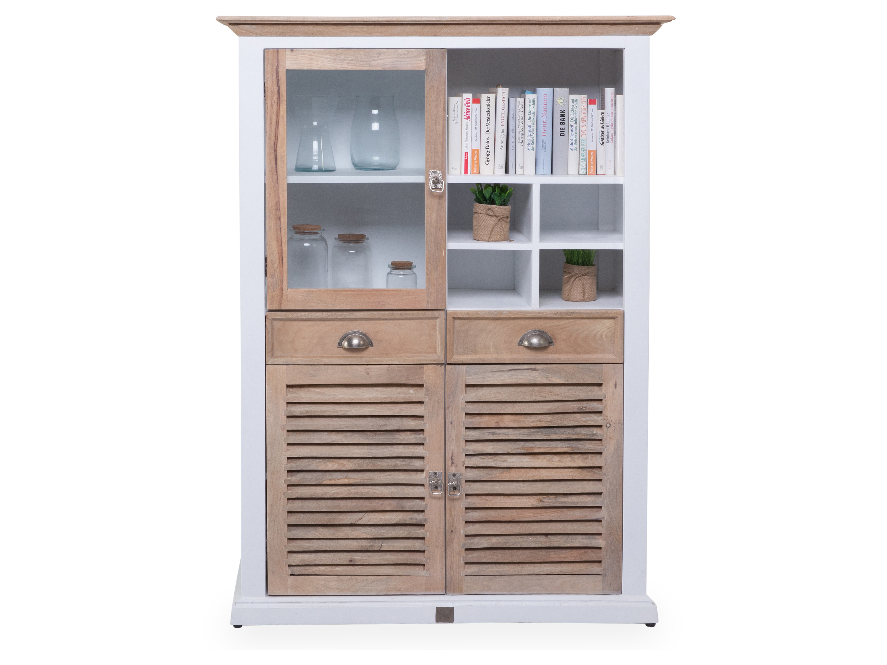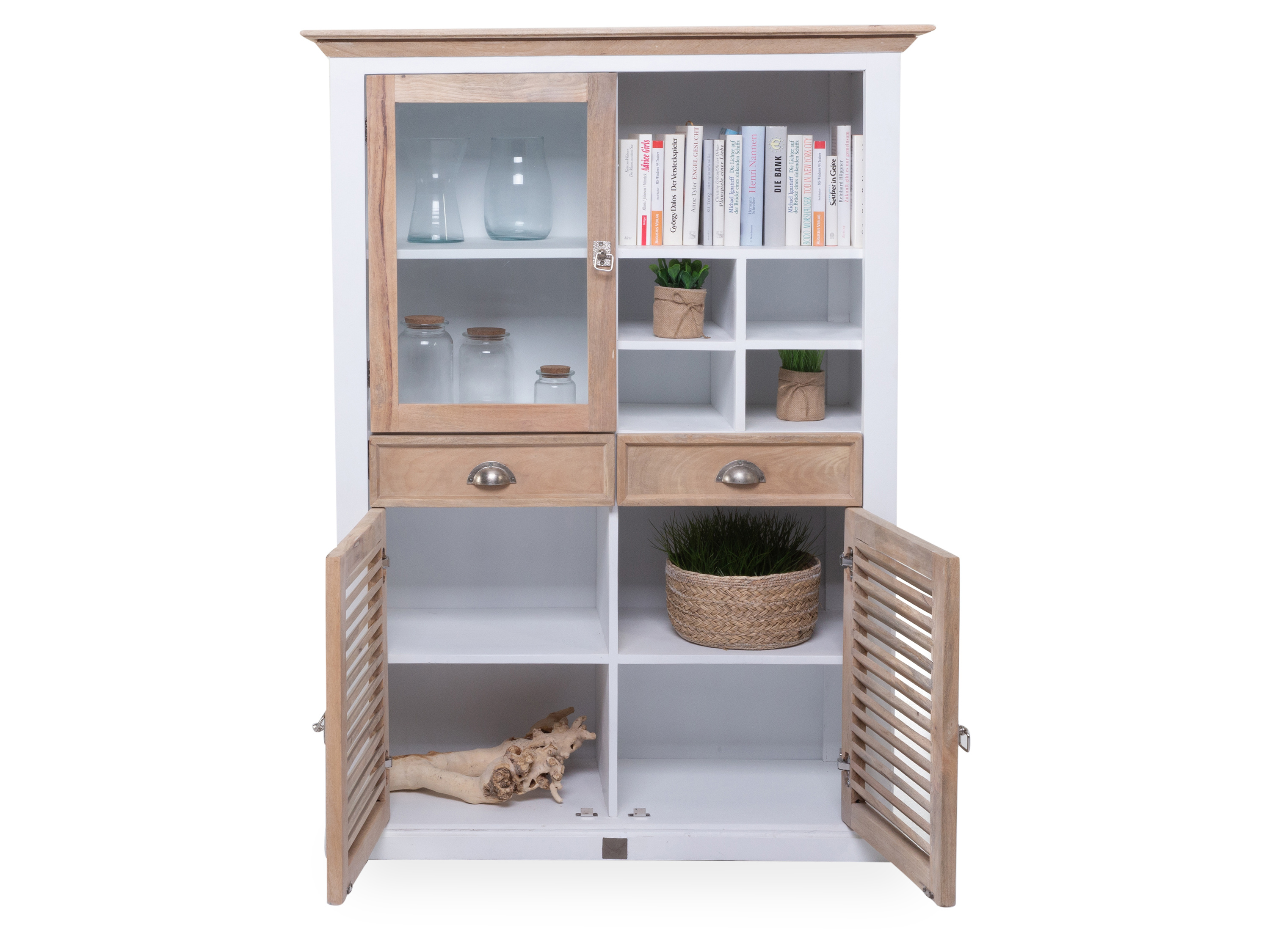 · mit zwei Holztüren, einer Glastür, zwei Schubladen fünf offenen Fächern und drei Einlegeböden