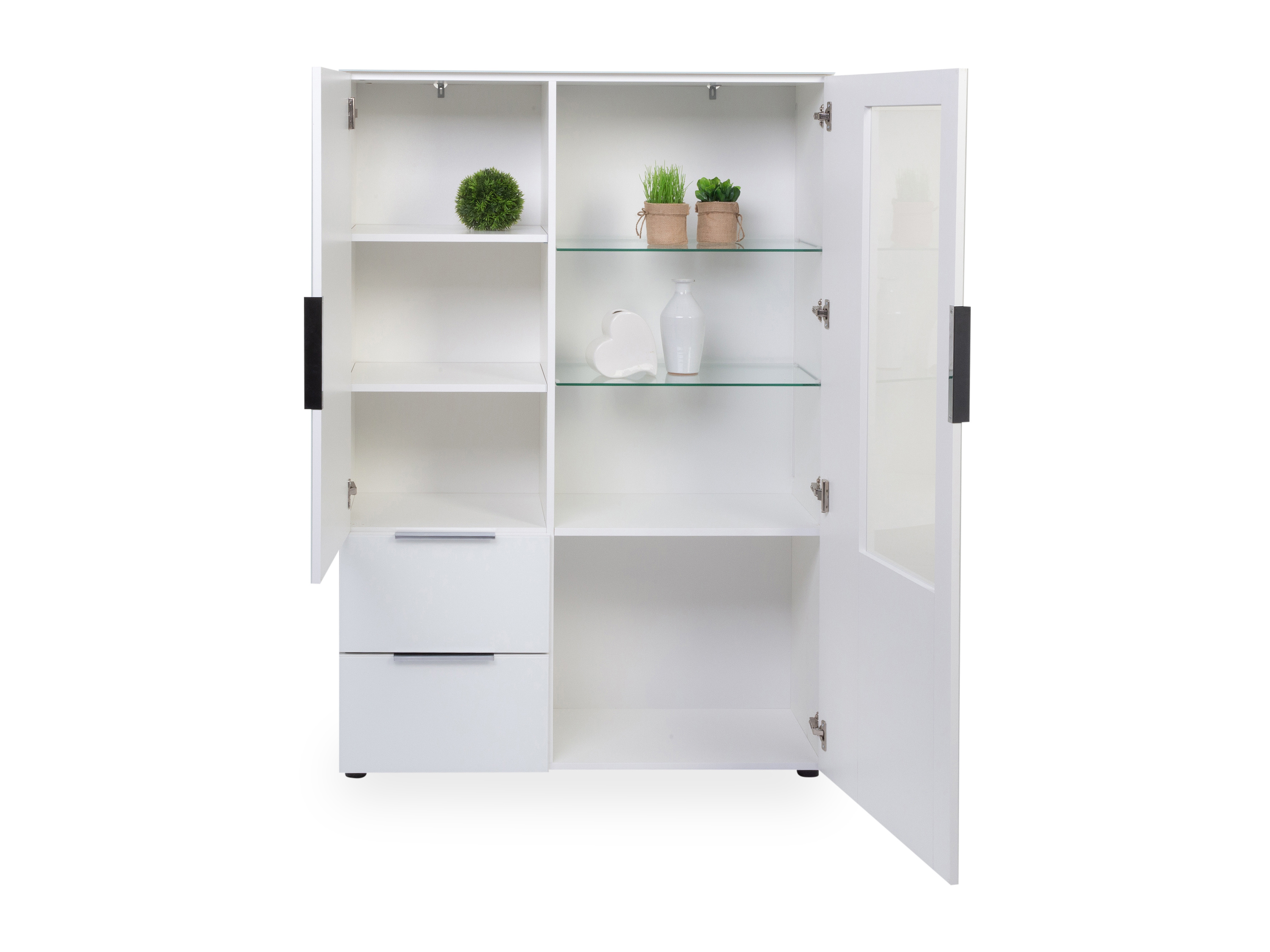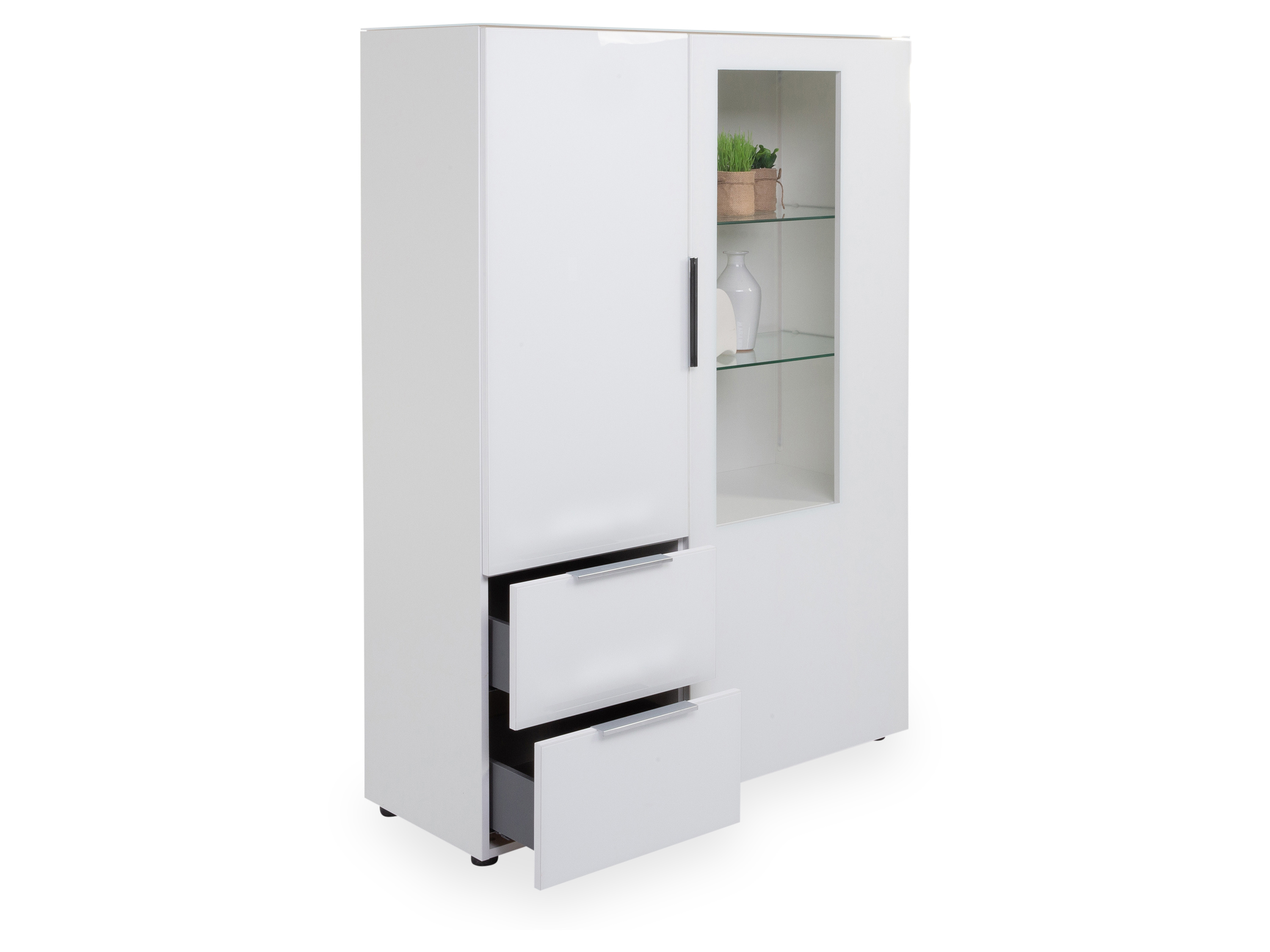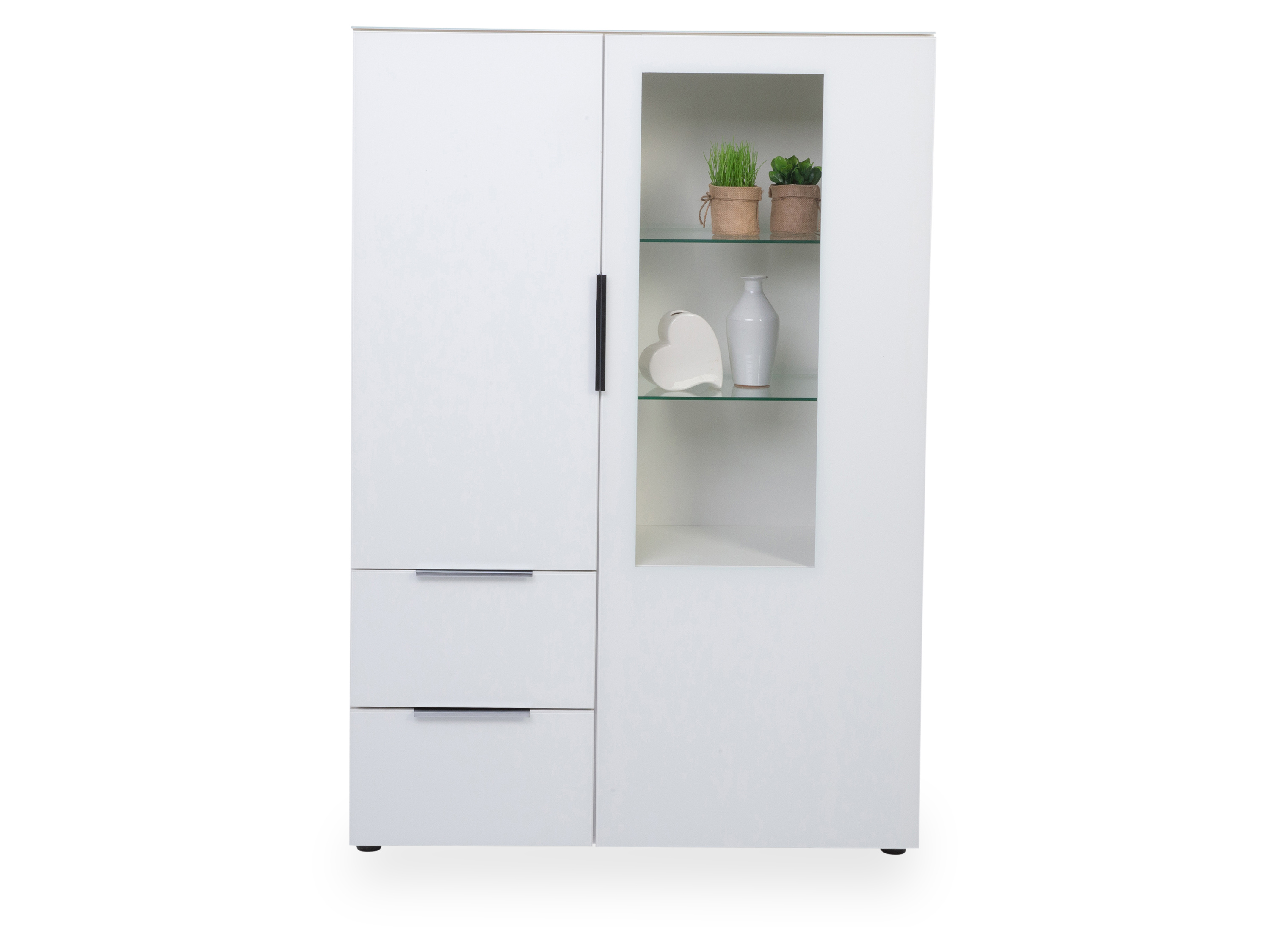 · mit einer Tür, einer Tür mit Teilverglasung rechts, drei Einlegeböden, zwei Glasböden und zwei Schubladen mit Unterflurauszug