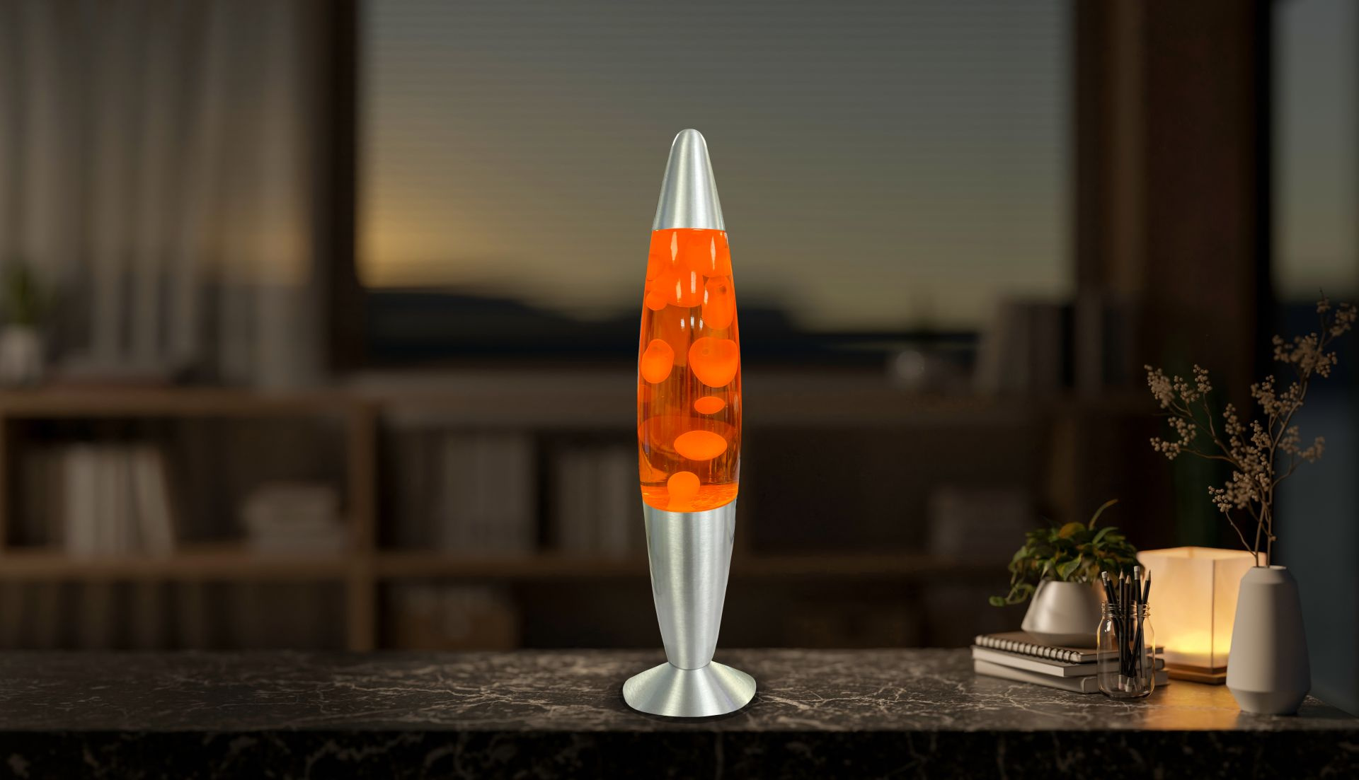 · Glas/Metall · Lichtfarbe: warmweiß · orange Flüssigkeit mit weißer Lava · Aluminium Sockel... mehr