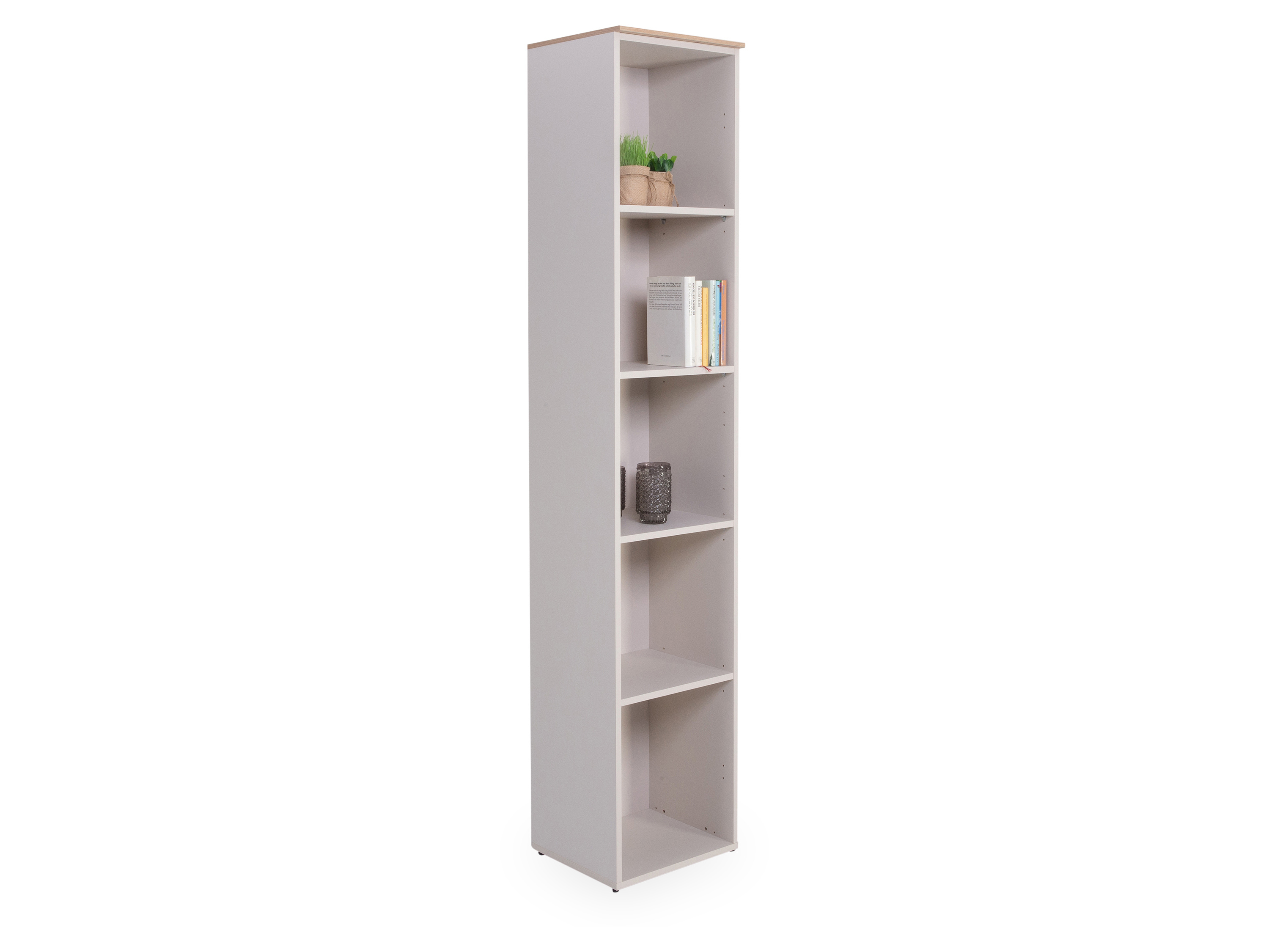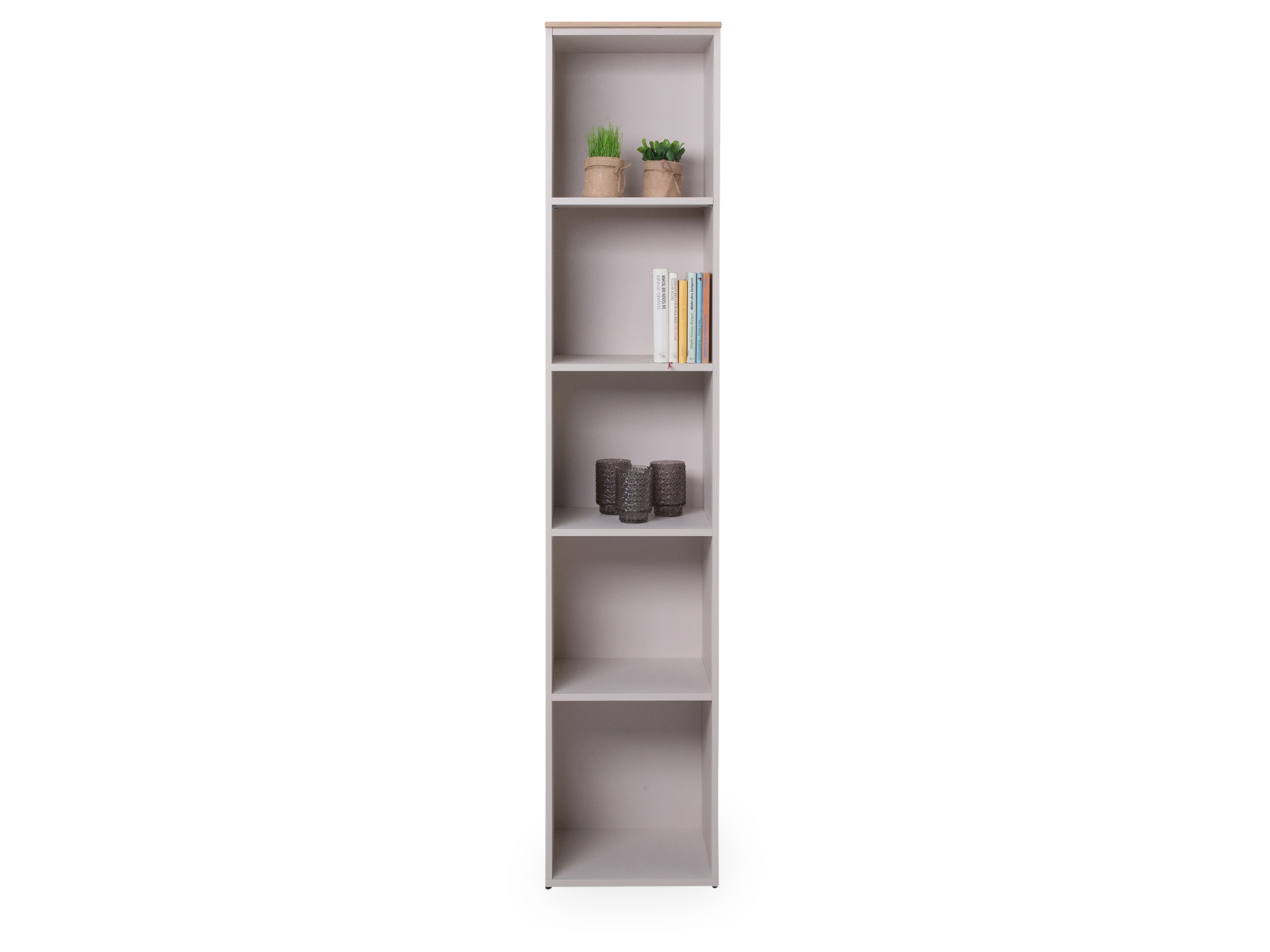 · Korpus: Cashmere grau Top matt · Oberplatte: Artisan Eiche Nachbildung · mit fünf Regalböden mehr