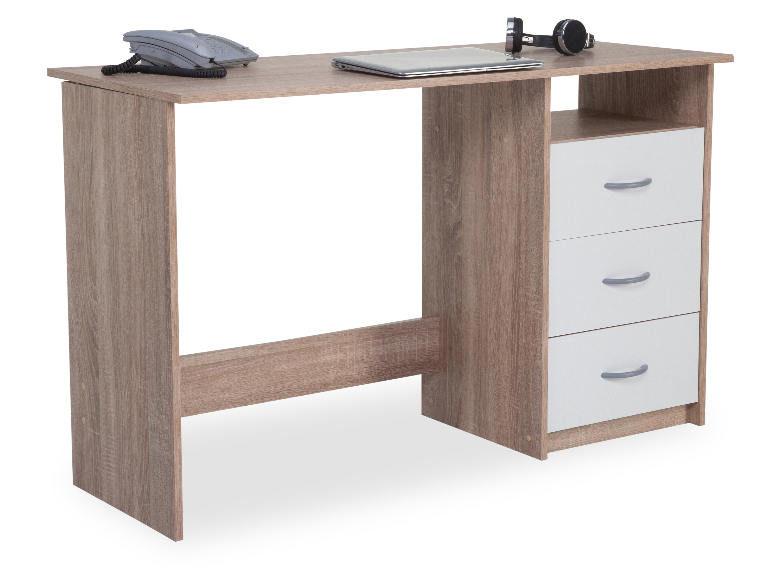 · Platte: Dekor Sonoma Eiche · Front: Dekor weiß · Füße: Kunststoff schwarz · mit drei... mehr