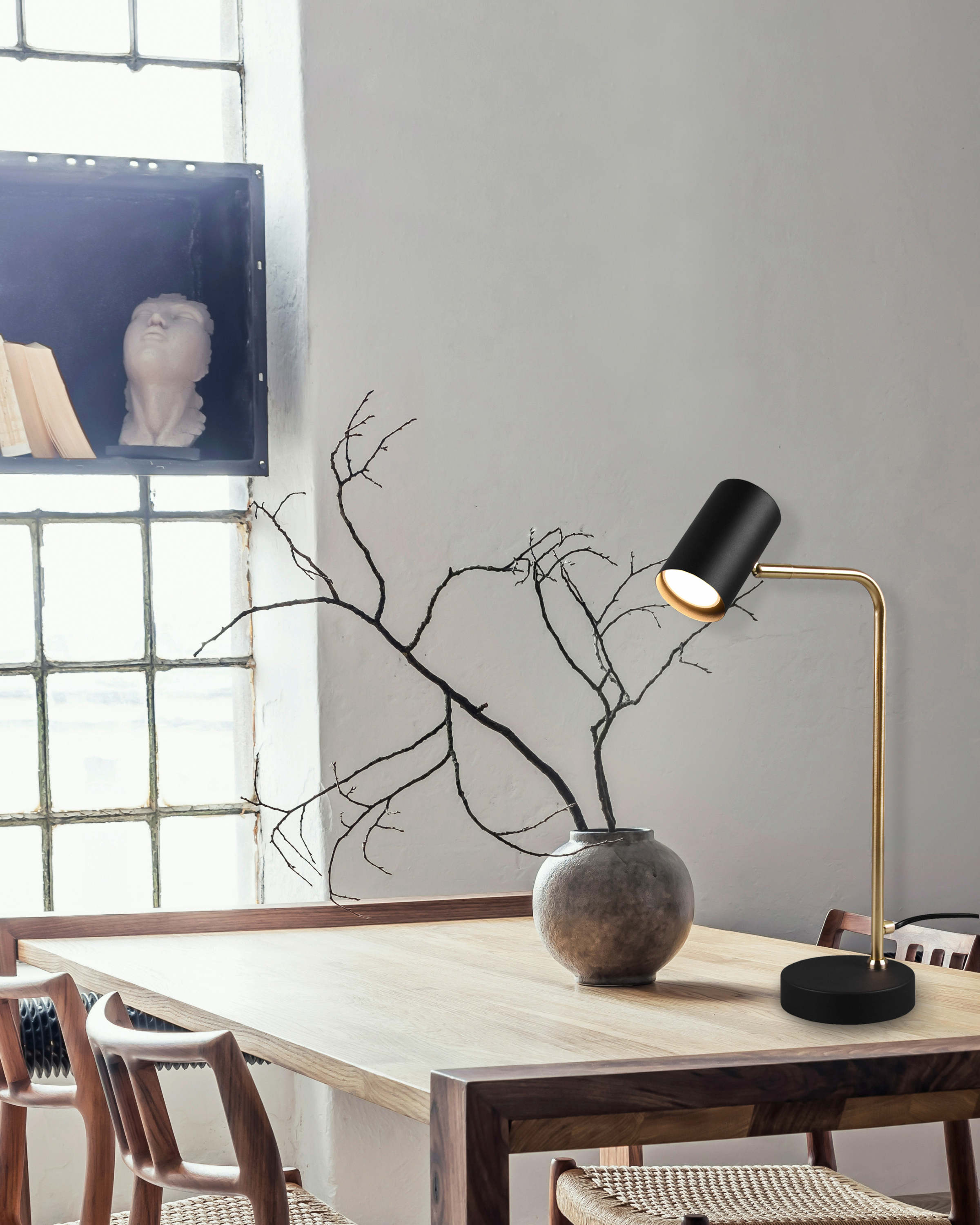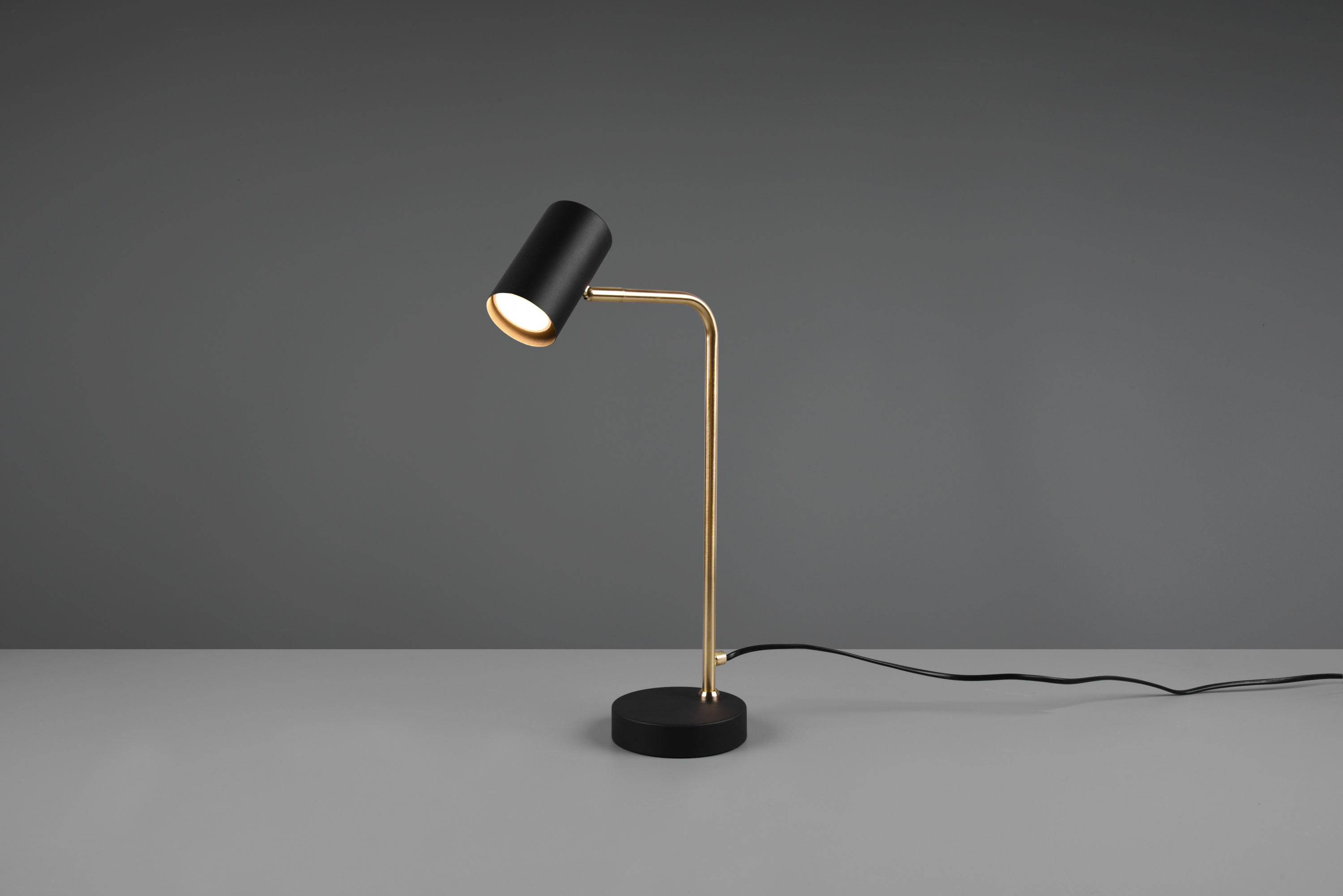 · Der minimalistische Einrichtungstrend wird immer beliebter und sorgt für ein beruhigendes und harmonisches Umfeld. Durch die klaren Linien und dem reduzierte Design der Tischleuchte MARLEY, tritt das Licht in den Fokus und spendet stimmungsvolle Lichtakzente. Der Leuchtenkopf ist beweglich und kann frei nach oben und unten ausgerichtet werden. Ob als Leselicht auf dem Schreibtisch oder als Akzentlicht auf der Kommode, die Tischleuchte setzt besondere Plätze optimale in Szene. Durch die Kombination der Farben Schwarz matt und Messing matt wird eine moderne Leuchte kreiert, die farbliche Kontraste setzt. Für eine energiesparende Beleuchtung empfiehlt sich die Verwendung eines LED Leuchtmittels. Diese sind eine optimale Alternative zu herkömmlichen Halogen Leuchtmitteln und stehen für eine hohe Lichtqualität und eine Energieeinsparung von bis zu 80%. Zusätzlich profitieren Sie bei LED Leuchtmitteln von einer langen Lebensdauer, einer geringen Wärmeentwicklung und schonen gleichzeitig die Umwelt.
